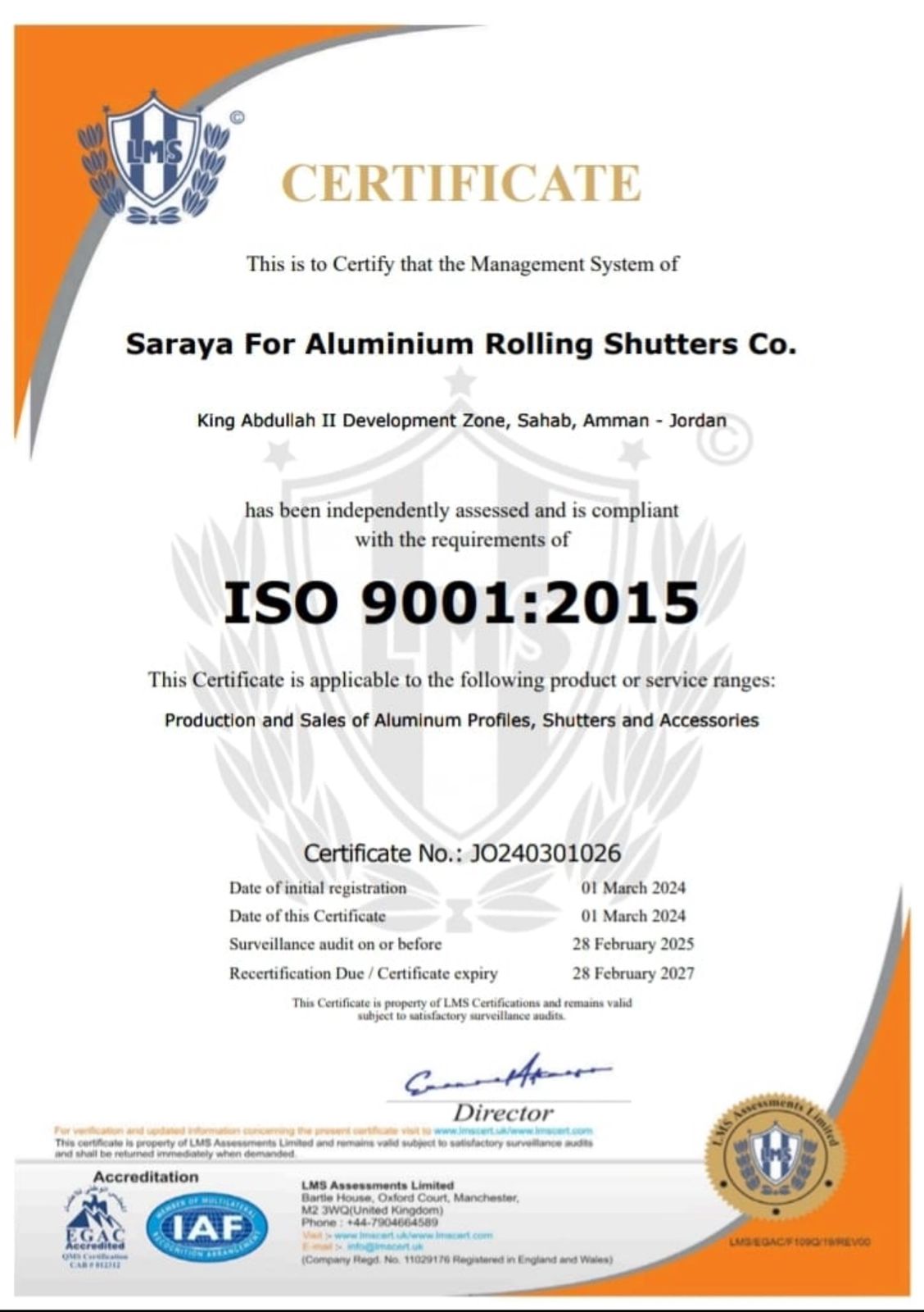 At Saraya For Aluminium Rolling Shutters, we’re proud to uphold the highest standards in the industry. Our operations are backed by internationally recognised certifications that reflect our commitment to quality, safety, and continuous improvement.